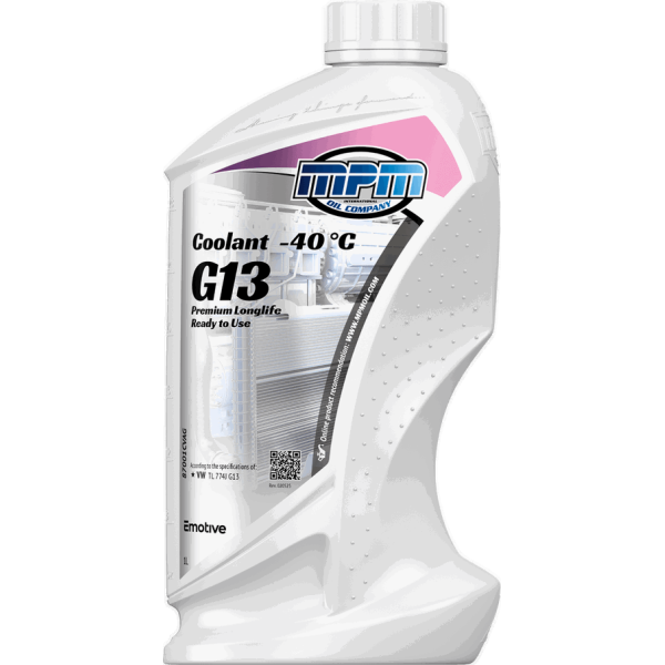 MPM Antifreeze G13 -40 °C Ready to Use Premium Longlife yra paruoštas naudoti aukštos kokybės aušinimo skystis su ilgalaikio veikimo technologija (LOBRID), pasižymintis –40 °C šalčio apsauga ir suderinamumu su VW TL 774-J (G13) specifikacijomis.
